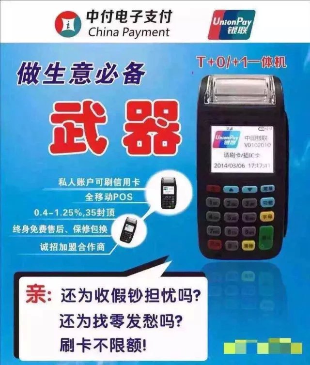 你还在担心你客户说没现金,而迟迟不付款吗?你还在担心你客户总拿只有信用卡没有钱给你吗?买个POS机放在口袋里,走到哪里都可以收款。再也不用担心收不回钱了。我公司推出新业务:POS机持有中国人民银行核发的支付业务许可证,是全国237家支付公司之一,官方授权,安全可靠、高效、低费率、可选择T+0或T+1到账、信用卡储蓄卡都可刷、个人和公司皆可办理、办理手续简单。