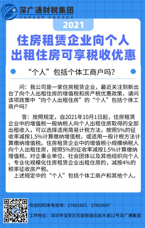 住房租赁企业向个人出租住房 可享受税收优惠哦 欢迎新老客户前来咨询 企业之家深广通 让创业更简单,让经营更轻松 电话:27601687、27602687、27602587 地址:深圳市宝安区石岩街道石岩大道12号金色雅苑商业1-3号1-2楼(公学-环保所右邻) |