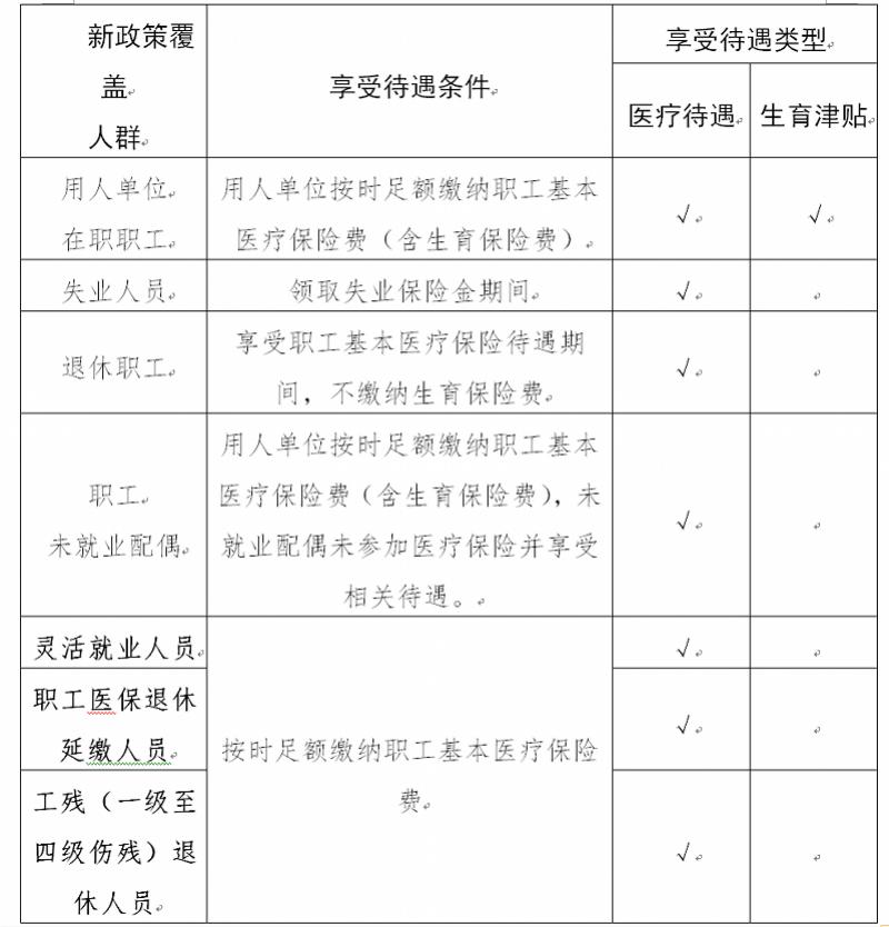 在原有的在职职工、职工未就业配偶、失业人员等可以享受生育保险相关待遇基础上,新增灵活就业人员、职工医保退休延缴人员、工残(一级至四级伤残)退休人员等3类人群,无须缴纳生育保险费,也可享受生育保险医疗待遇。