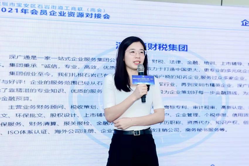 宝安区工商联(总商会)专职副主席(副会长)石慧娟,石岩街道工商联(商会)主席(会长)白建文,常务副主席(常务副会长)赖海彪、罗欣、叶志锋,秘书长廖镜辉,副秘书长吴凯旋、刘芳丽等一同出席此次会员企业资源对接会。