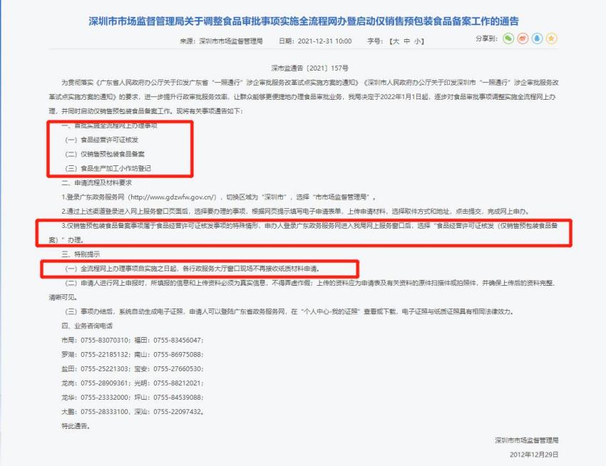 食品经营许可证核发、销售预包装食品备案、食品生产加工小作坊登记从2022年1月1日起实行全流程网上登记,现场不再受理纸质材料申请。